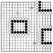 | Territory is called'ji'in Japanese.  Diagram 2 shows some examples.  The continuous lines formed by the black stones form the limits of the territories.  The size of territory is expressed in terms of the number of open intersections within it.  The unit is called a point,'moku'in Japanese.  The territories marked A, B and C are all of the same size..12 points for the black player.  Incidentally, it is obvious here that to form territory, it is most efficient to make use of the edge lines as in the case of Pattern A.  Pattern B, which makes use of one edge line is not as economical as A, but more economical than C, which must be entirely bounded by lines of stones. |   |