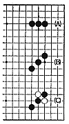 | The unit for the number of stones is also called 'moku' the same as in the case of territory.  All stones are of equal power, but like soldiers in a battle, the stones in a good configuration are more powerful than those in a poor pattern, in which the stones cannot function as effectively and economically.Stones of the same color form a firm line when they are placed contiguously along a straight line as in (A) in Diagram 3.  These three black stones cannot be cut off.  When they are diagonally contiguous as in (B), however, they are not directly connected with one another.  Therefore, they can be cut off if the opponent places his stones as in (C).  Remember an isolated stone means less power for the contestant who has such a stone. |   |