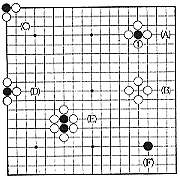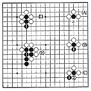 | In Patterns A of Diagram 5, the black stone would be killed if the white player places the fourth stone at (a). This situation is called'atari. 'The player whose stone is in an'atari'can'run.' This may be done by placing another black stone next to the one on the board as in Pattern B. But if the second black stone is placed diagonally as in Pattern C, it is meaningless, because the white player, by placing the fourth white stone at (2) can still kill the first black stone. The black stone to be placed at (1) in Patterns D and E shows the black player's attempt at running away from capture. Pattern F in Dia.4 shows a stone with four liberties (breathing spaces). |   |