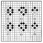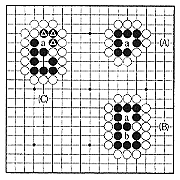 | When a stone or stones are removed after going through an'atari,'this means'instantaneous death.' On the other hand, there is another kind of'death'for stones those stones which, though kept on the board, are destined to die. Patterns A and B in Diagram 9 show such doomed stones. If a match ends with these stones in the same condition, they may be simply removed by the white player.In short, surrounded stones'die'so long as they cannot make'eyes.' |