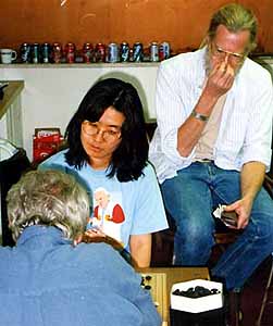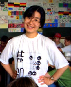 prizes.) The "beer-drinking tournament": this was really awesome. It was held at last year's European Go Congress. Each game the players had to drink a large mug of beer. If there was any left, you were disqualified. The time allowance was 30 minutes with no byo-yomi. Moreover, it went for two nights in a row and I was surprised at how many participants there were. People also go in for all kinds of go goods over here. Each club makes its own goods with their logos and all the members wear the same outfits. The country hosting the European Go Congress every year goes to a lot of trouble to design distinctive T-shirts, mugs, hats, stickers, and so on for sale at the congress and they're always popular. I was very surprised the first time I discovered the four postcards of professional players (Iwamoto, Go Seigen, Sakata, Kobayashi Koichi) produced by the British Go Association. These are freebies given away with books, and you can't buy them separately. I wonderif I am the only one who wants the freebies more than the books? Actually I'm a collector of go T-shirts. I have about 20 and I wear them in rotation. They attract attention and people often ask me about them in the street. Now that go has spread around the world, there's a lot we can learn from other countries. |