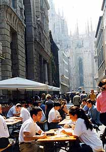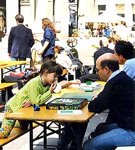 | The symbol of Milan is the Duomo (cathedral) that soars up in the centre of the city. This is the second-biggest dome in the world. It is surrounded by the city's busiest and most luxurious shopping area, which is constantly thronged with people. One day early in summer, the city's main thoroughfare, the Vittorio Emanuel II Avenue, was closed to traffic and the 2nd Games Festival was held. This festival was inaugurated last year and was very successful, so, with support from the City and sponsors, it has been continued this year. Groups representing about 20 different games set up stands designed to attract interest on the avenue. They hand out pamphlets to passers-by, give demonstrations, and teach. What with it being Sunday, the ?-kilometer-long avenue was crowded with people, so this festival is probably the most effective way to gain extra fans. Familiar games like chess, checkers, bridge, Othello, scrabble and card tricks were of course prominent, but mahjong and shogi also participated. They may be Asian games, but these were no Asian faces -- they were being promoted by local players. Pokemon (pocket monsters), which had started being televised at the end of last year and had leapt to popularity with Italians, also made an appearance. A large Pikachu undulating along the avenue stood out in the crowd. |