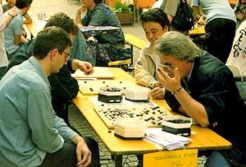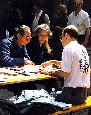 | Mr. Oka, the president of the Italian Go Federation (who was featured in the July issue of Monthly Go World), and the members of the federation were kept busy from morning to dusk dealing with all the visitors. They were all wearing the federation uniform of a polo shirt (printed on the back with calligraphy by Takemiya for "cosmos"!); they were sweating from the heat -- the temperature rose above 30 degrees -- but they dutifully kept at their task all day long. Some of the Japanese tourists who visit Milan throughout the year joined in and played games. In fact, some of them stayed with us all day playing. That reminds me, Japanese don't even make the top ten among tourists visiting Italy as a whole -- Germans are number one -- but Milan is special. Here Japanese tourists, who come for the shopping, are number one by a long way. It's hard to believe there's an economic slump in Japan when you see the number of Japanese thronging the high-class shopping areas. For someone like me, for whom shopping is a source of stress, it's a mystery. Let's be honest and confess. The reason why I feel so much stress is that I can't find sizes that fit me. It's not that the clothing is too big or too small -- rather, it doesn't fit my physique. My pure Japanese physique is just too different from the Italian model. After some mortifying failures in shopping expeditions, I started to hate shopping. If you go to the really expensive boutiques, however, they apparently have clothes tailored to the Japanese physique, but you have to be able to afford them. That's how I got so interested in collecting go T-shirts. |