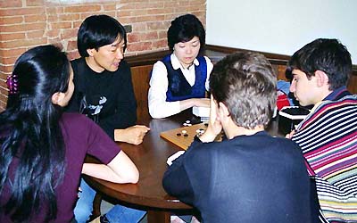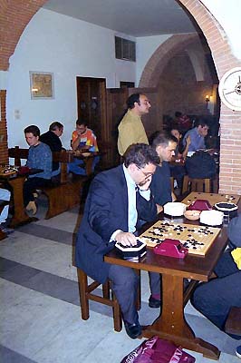 atmosphere. At present, the club meets every Tuesday night. The members assemble in a cafe on the bank of the Arno river, which flows through the centre of the town. The tournament was also held in this cafe, with about 20 participants. The strongest player is 8-kyu, equivalent to 3- or 4-kyu in Japan. This was a region that previously had been completely ignorant of go. Securing such a solid base in only one year is really impressive. When they first started, the players learnt the rules from the Net. They discovered the Federation, got teaching materials, taught their friends, and looked for a club venue. The effort involved is unimaginable in Japan, where go had merged into society, but it's nothing unusual overseas. Actually, last year there was major progress in using the Net to spread knowledge about go. There are also European-made go sets that are easy to buy. I think go is entering a period of rapid development and change. For a long time, the centre of Italian go was Milan, but in the last year or two go clubs and fans have been sprouting up in new regions, including Pisa. Florence, Bologna, Naples in southern Italy, Bari, the island of Sardinia, etc., etc. To all go fans: when you are making your shopping + gourmet trip to Italy, how about checking out the go clubs too? |